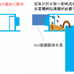 ペデストリンデッキにて鋼製排水溝と接続した、泥流れ対策を施した排水桝の例になります。こちらをご覧下さい。