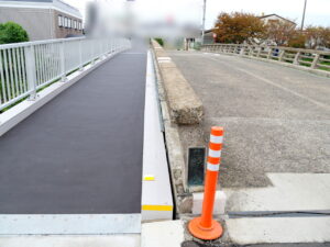 右側の車道の橋に横向きの天板プレートが設置されております。隙間から確認ができます。