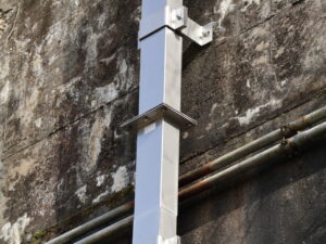 フランジ一体とし角管を分離式とし現地で接続しています。(中間箇所で接続しているのが確認できます。)