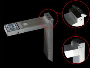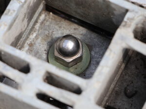 本体はステンレスSUS304、グレーチングは鋼製のめっき品です。絶縁の為、耐電食加工を施したボルト、絶縁(FRP製)ワッシャを使用しています。