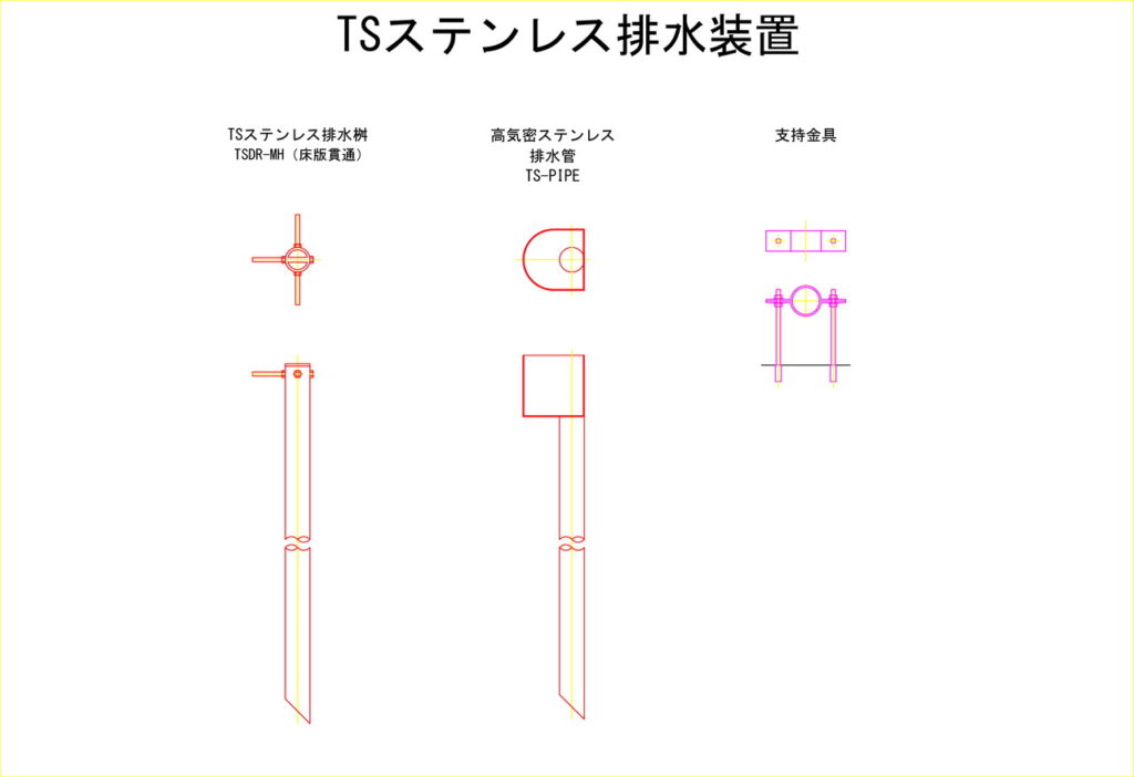 - E.01 TSステンレス排水桝、E.04 高気密ステンレス排水管