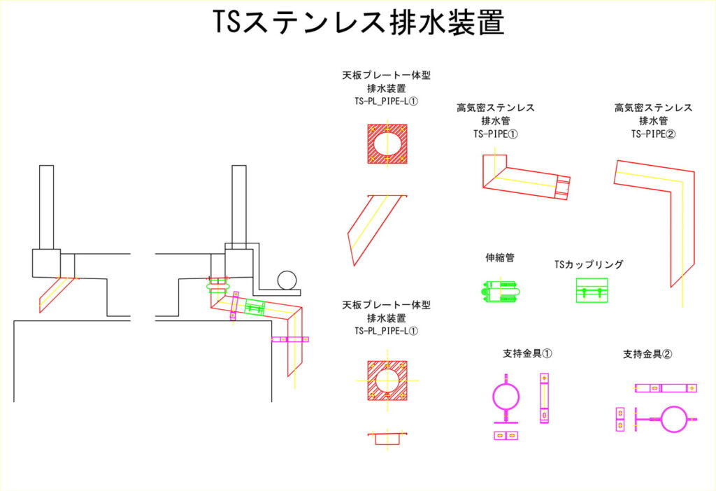 - E.02 天板プレート、E.04 高気密ステンレス排水管