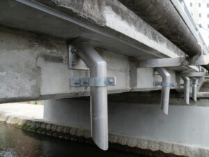 橋梁補修における排水装置の更新や、補修(保全・維持管理)設計において排水装置を検討されている現場担当者・設計者・建設コンサルタントの皆様に向けた参考資料として、設置後の現場写真に加え、参考図面や点検・調査時・施工時の写真等をご紹介します。