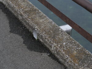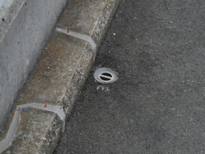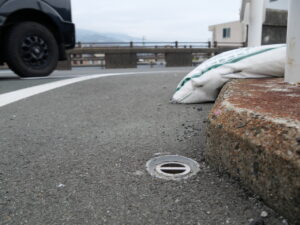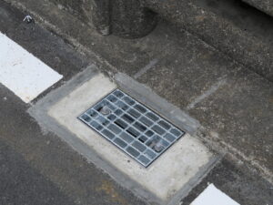 左側が本線橋でグレーチング仕様排水桝、本線橋を渡り左に曲がったガードレールのある個所が道路を拡幅するような形の箇所に床版貫通管(床版貫通管 PI×TARI管 TSDR-BHPx)、右側の側道橋に横向き天板プレートを採用頂いております。