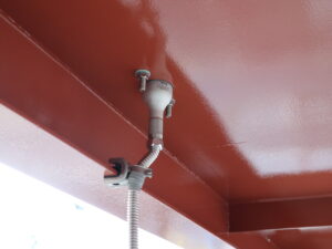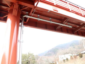 桁の下フランジでクリップ形状の金具を取付け、吊る形でフレキシブルチューブを支持しています。