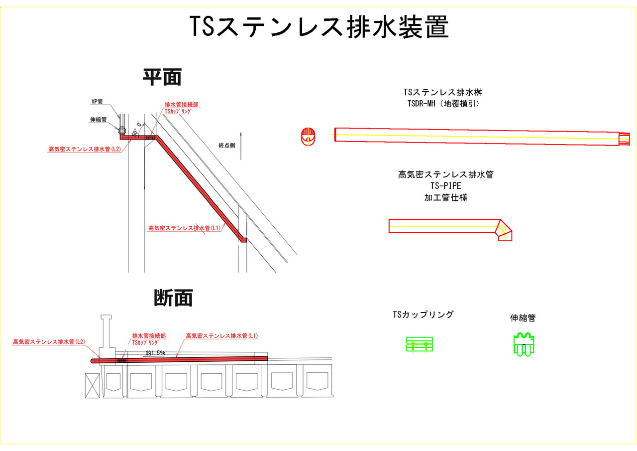 - E.01 TSステンレス排水桝、E.04 高気密ステンレス排水管