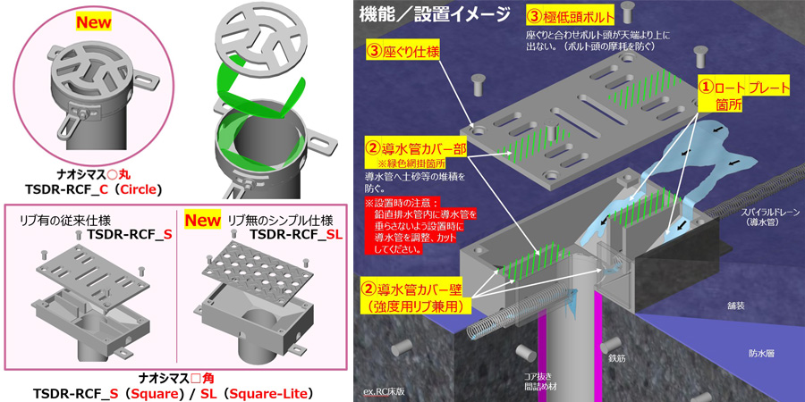 床版貫通管設置による排水桝になります。四角型・丸型の両方に対応した製品になります。