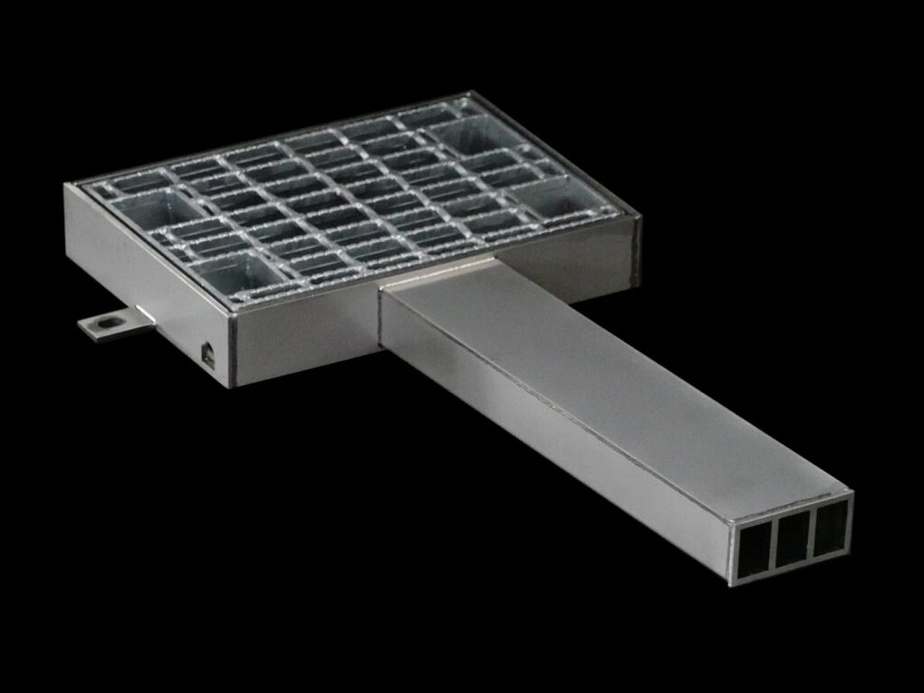 ペデストリアンデッキにて鋼製排水溝と接続した、泥流れ対策を施した排水桝の例