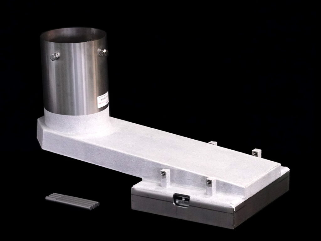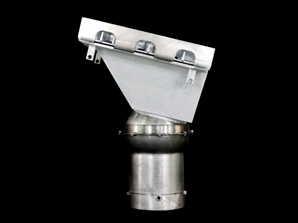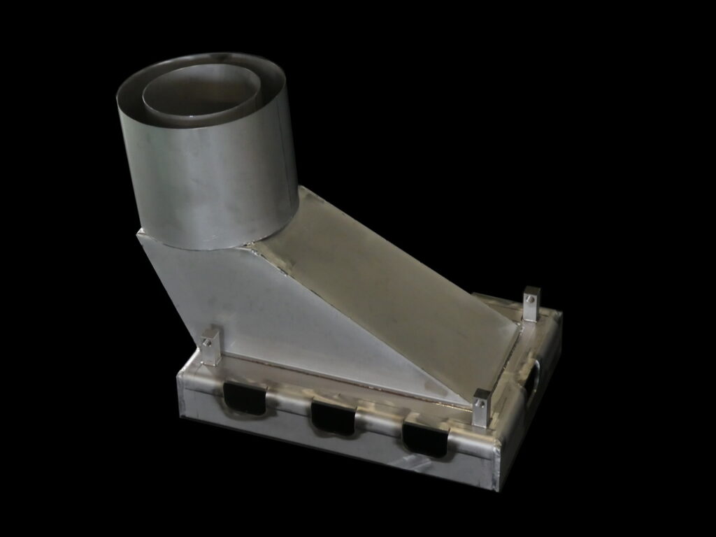 ○ ロート(ホッパー)下部のパイプ部分に全方位転換可能なジョイント構造をもち、上面と接続管中心の鉛直線との角度を自由に設定できる。