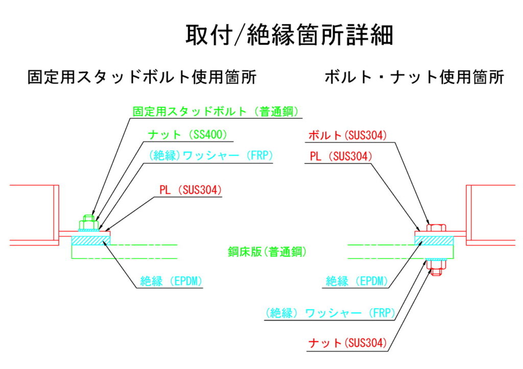 ○ 材質にステンレス(SUS304)を採用しているため腐食に対して耐久性がある。冬季橋面の凍結防止に使用される塩化カルシウム等の薬品による腐食に強い。