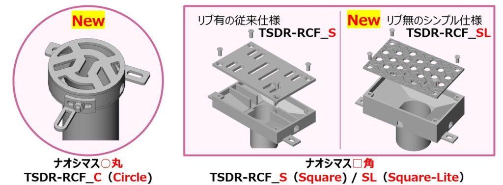 新たに丸型の「TSDR-RCF_C」と 角型にリブ無シンプル仕様の「TSDR-RCF_SL」を加え状況に応じ選択できるようになりました。