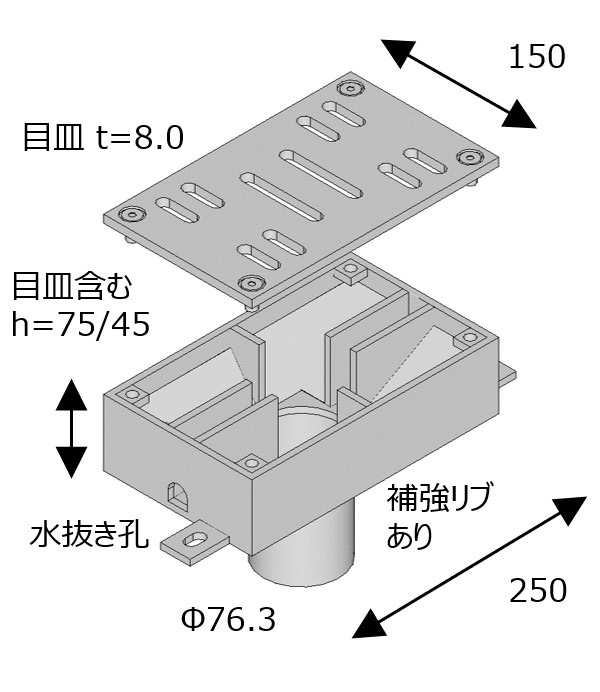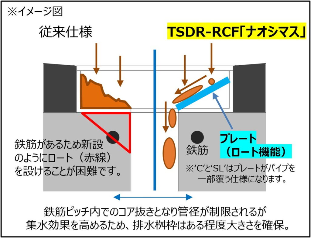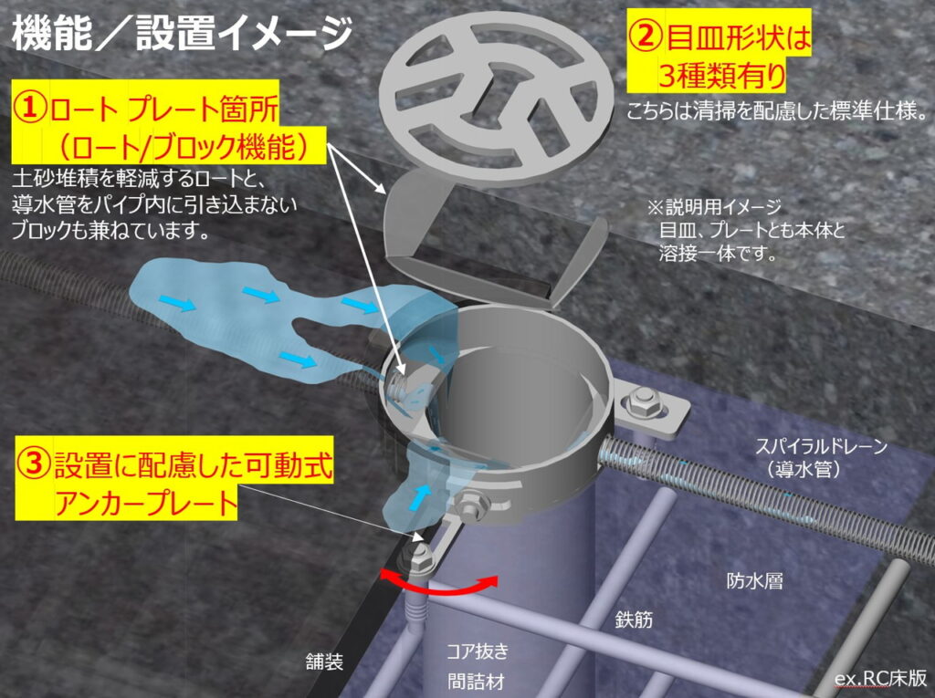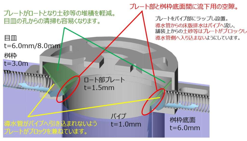 「ナオシマス」ではプレート立ち上げ+目皿で導水管を覆う構造とし土砂堆積を軽減。またこのプレートは全体の強度向上にも寄与します。