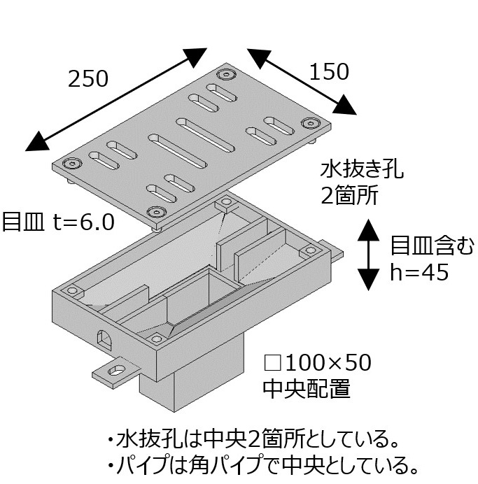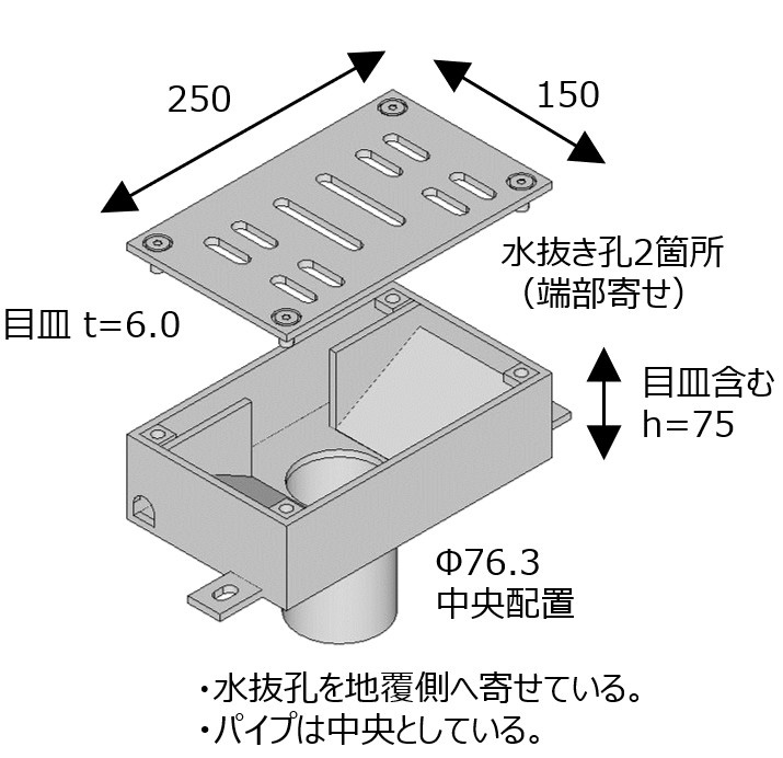 | △ ・目皿孔形状の自由度が低い。 ・この中では最も高価。 | ○ ・桝枠サイズ等、製作の自由度が比較的高い。 ・S(リブ有)仕様より安価。 | △ ・底面フラットとなり土砂等の堆積が発生しやすい。 | ○ ・集水面積は床版貫通管よりは大きい。 ・比較的安価 | △ ・目皿集水面積はこの中では最も小さい。 ・導水管がある場合、パイプを覆う。 |