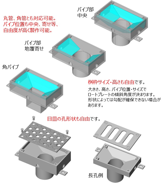 ※各種個別でのカスタマイズは可能ですが、製作上やロート勾配等の制約はございます。ぜひお気軽にお問い合わせください。