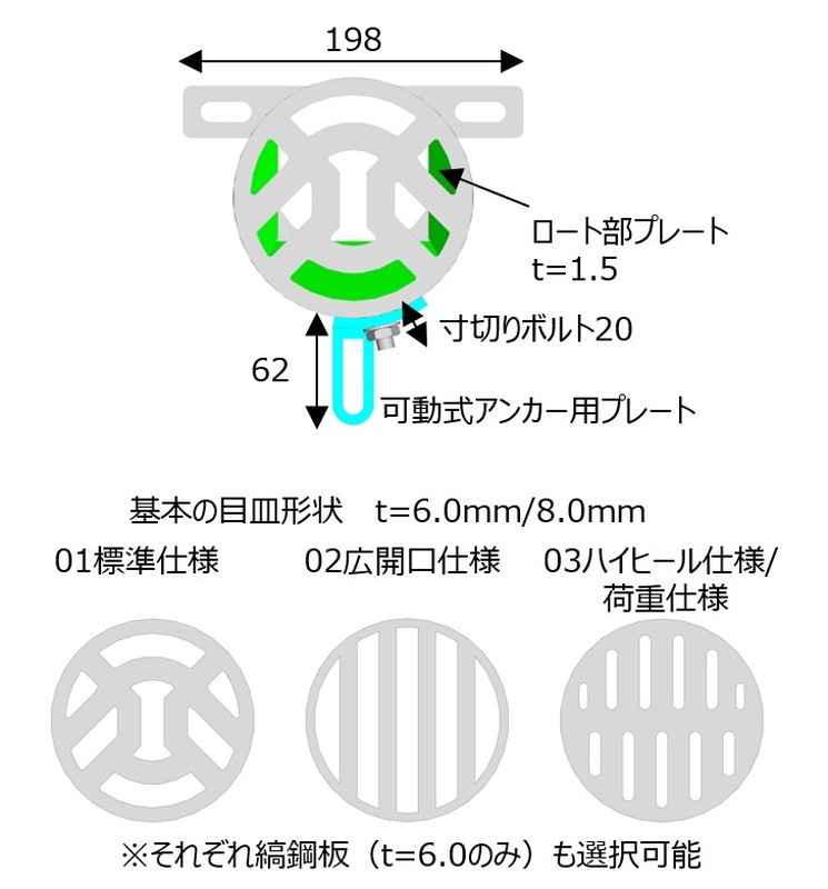 開口幅を狭くしています。 t=6は歩道でハイヒール対応が必要な箇所に、t=8は輪荷重(T-25)への配慮が必要な箇所等に。