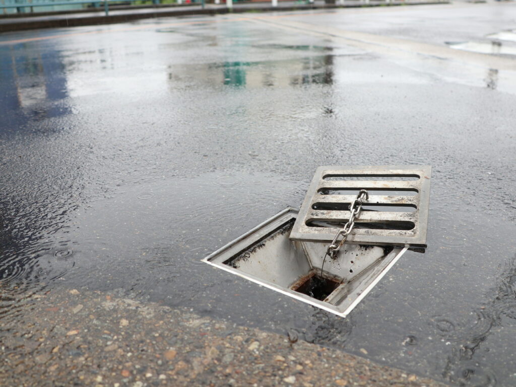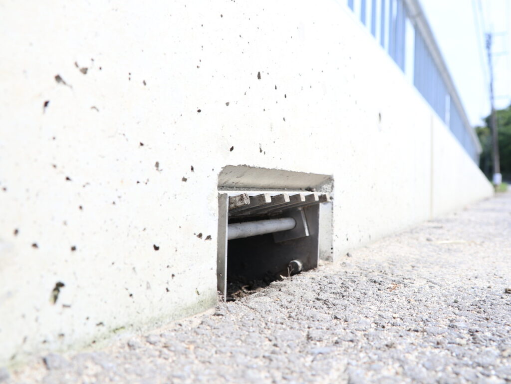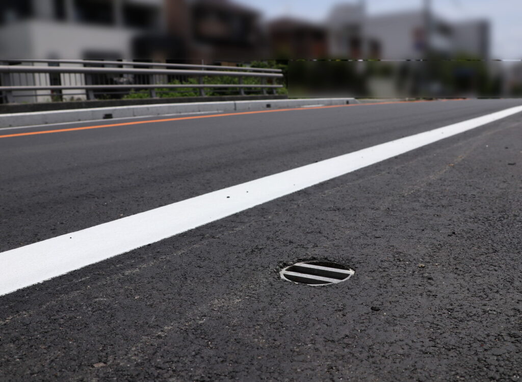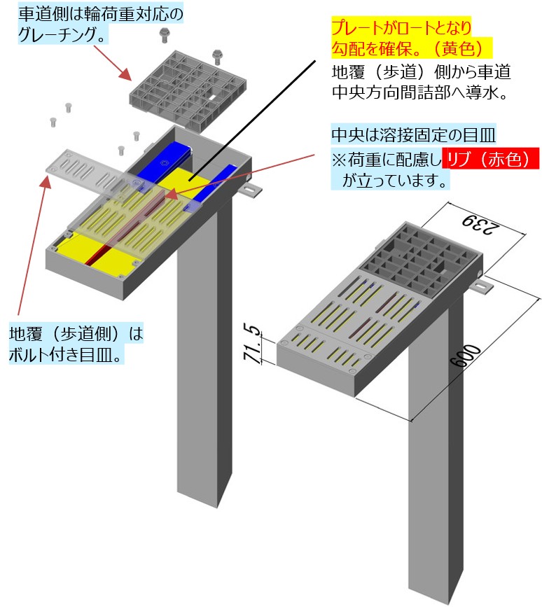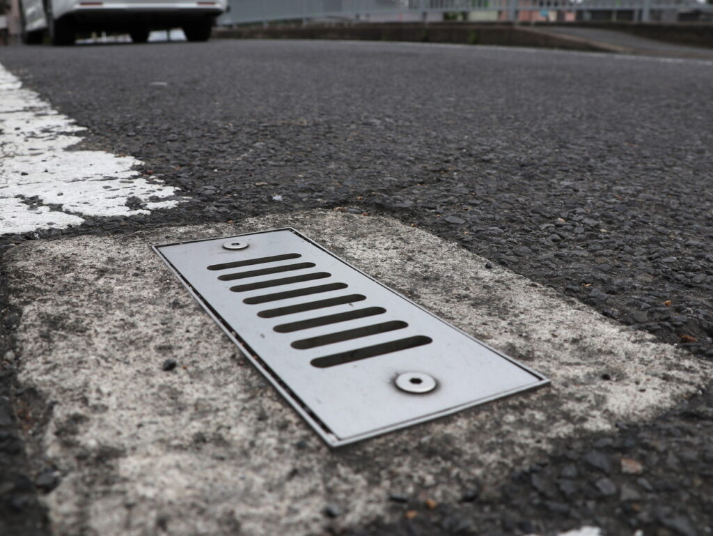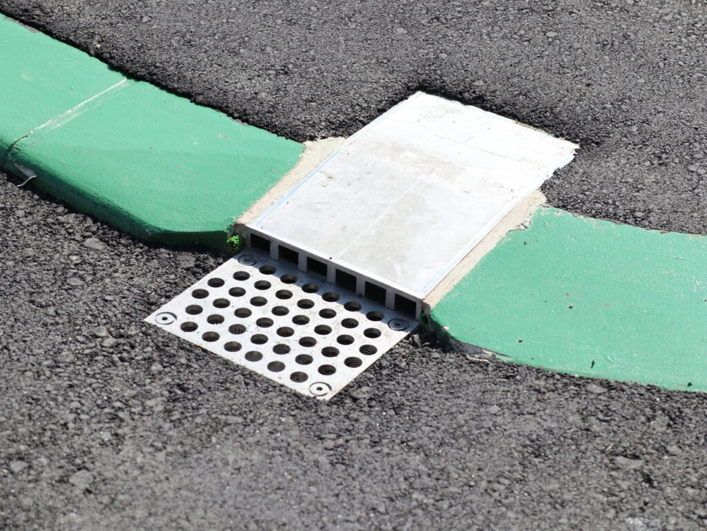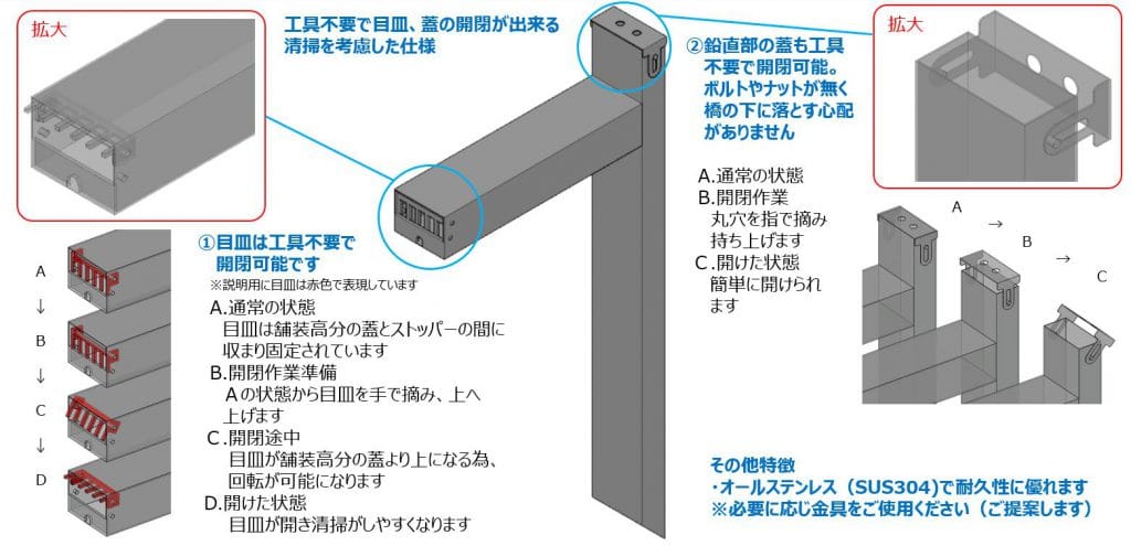 舗装天端からの集水可能な幅広目皿仕様、工具不要で開閉でき清掃がしやすい / 鉛直部の掃除蓋も工具不要で開閉可能です。