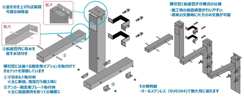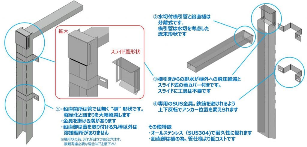 鉛直部は詰まりにくい樋仕様 / 横引部と鉛直部は分離式で設置の自由度が高い / 横引部の清掃が地覆外側から可能