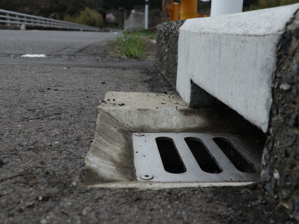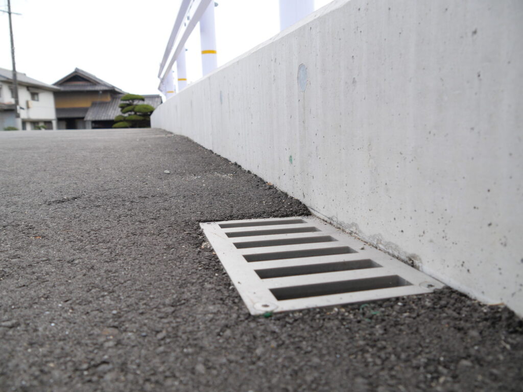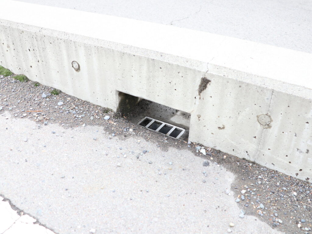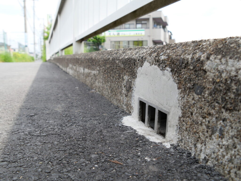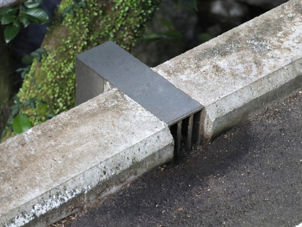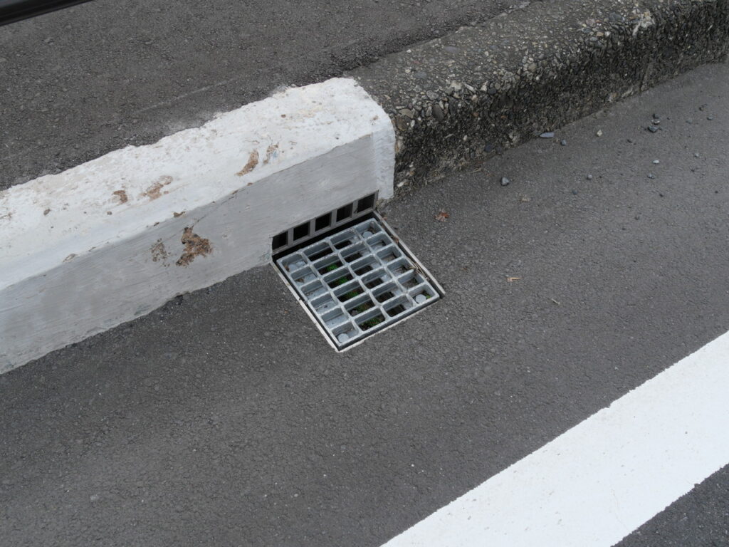 地覆横引きの延長の様な形で歩道の下に排水装置を通している事例