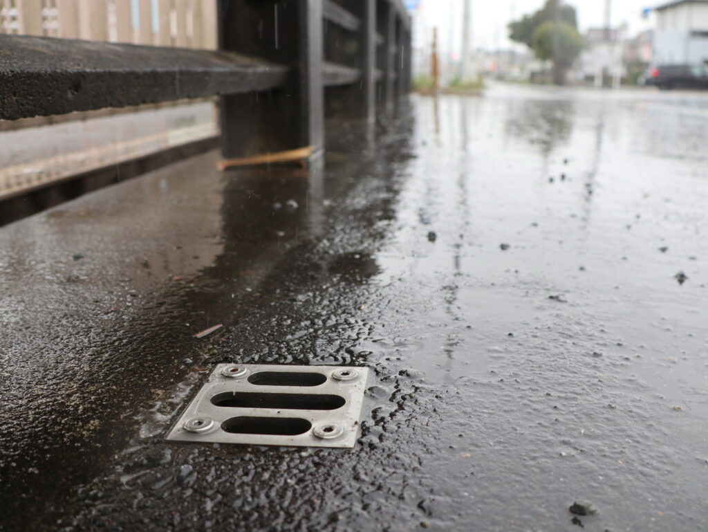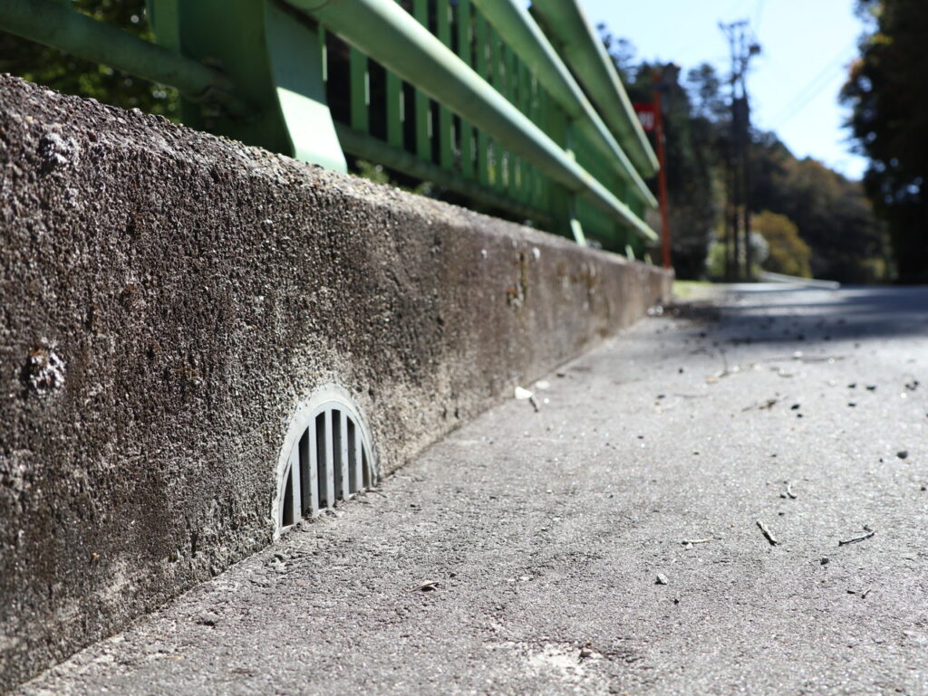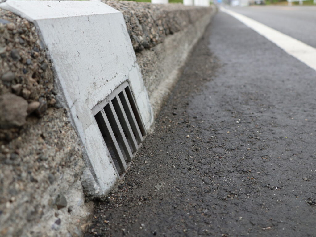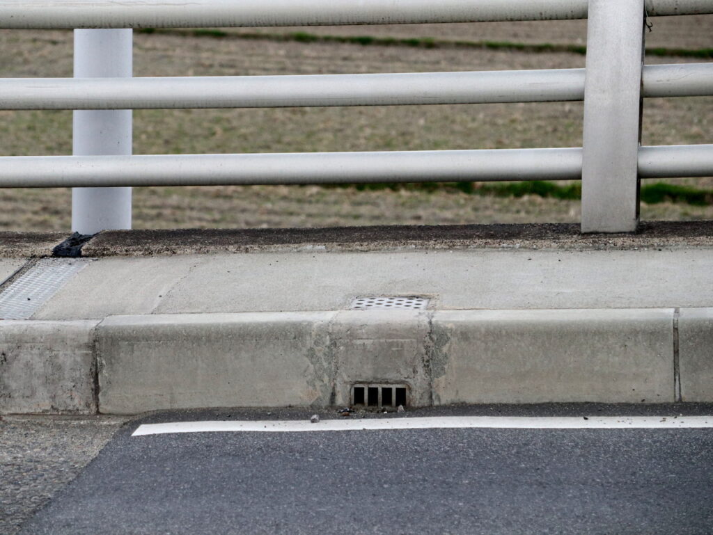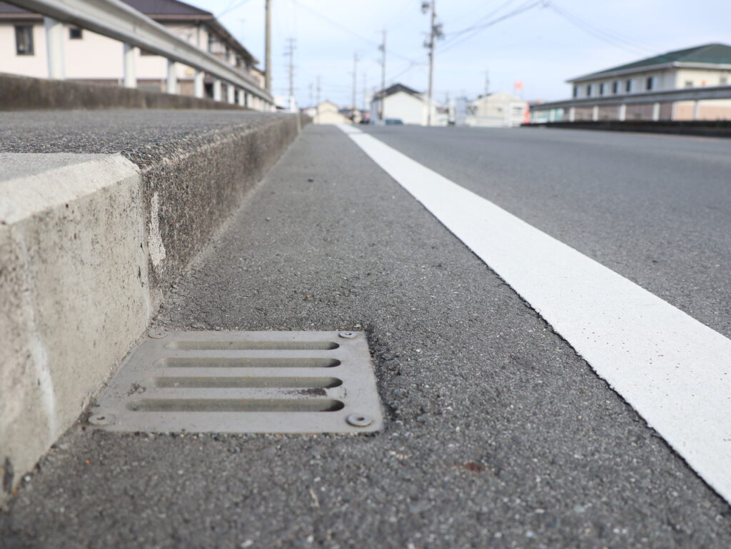 地覆横引きの延長の様な形で歩道の下に排水装置を通している事例