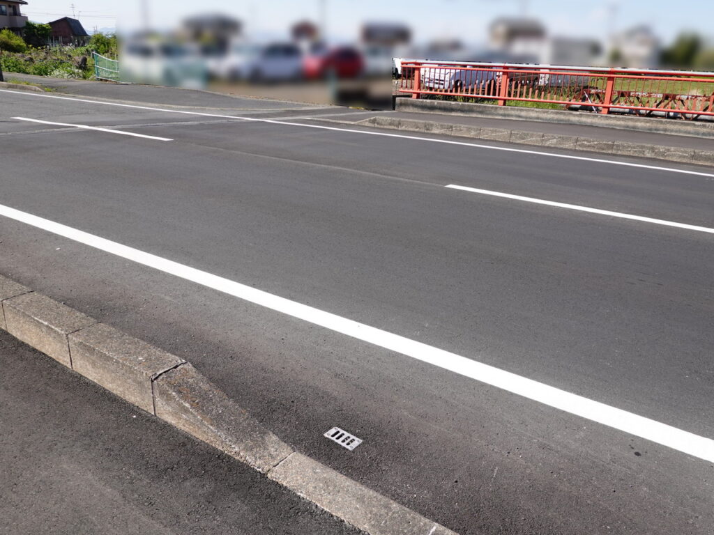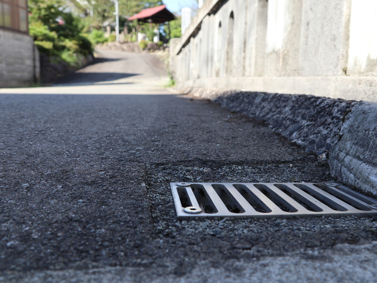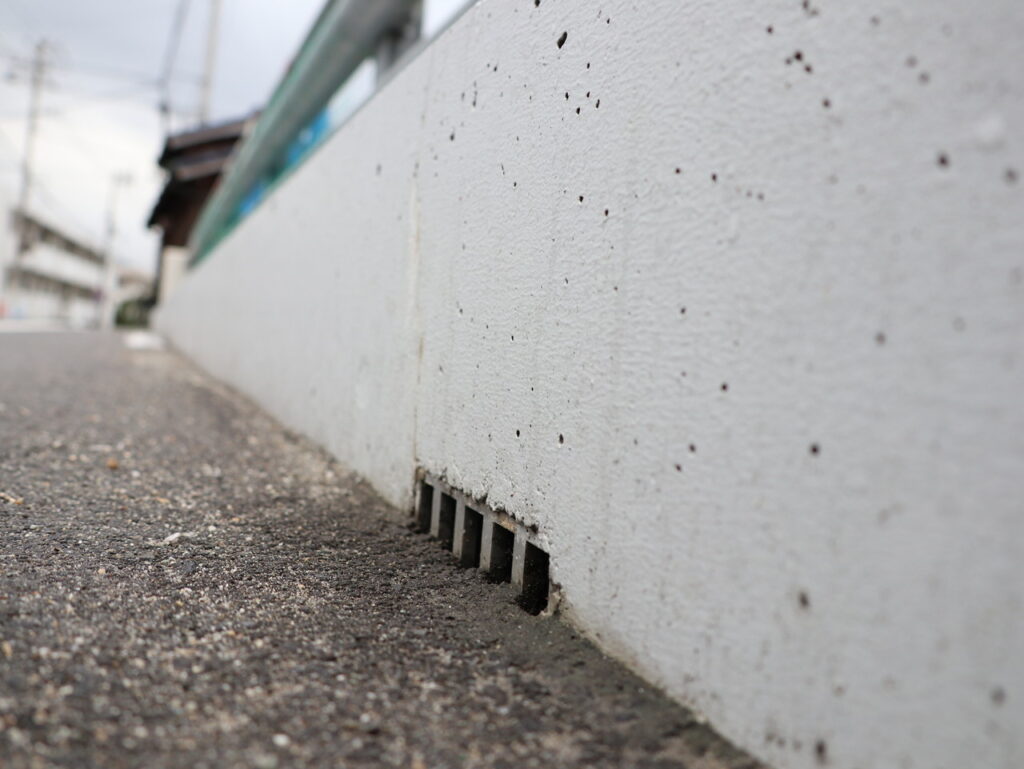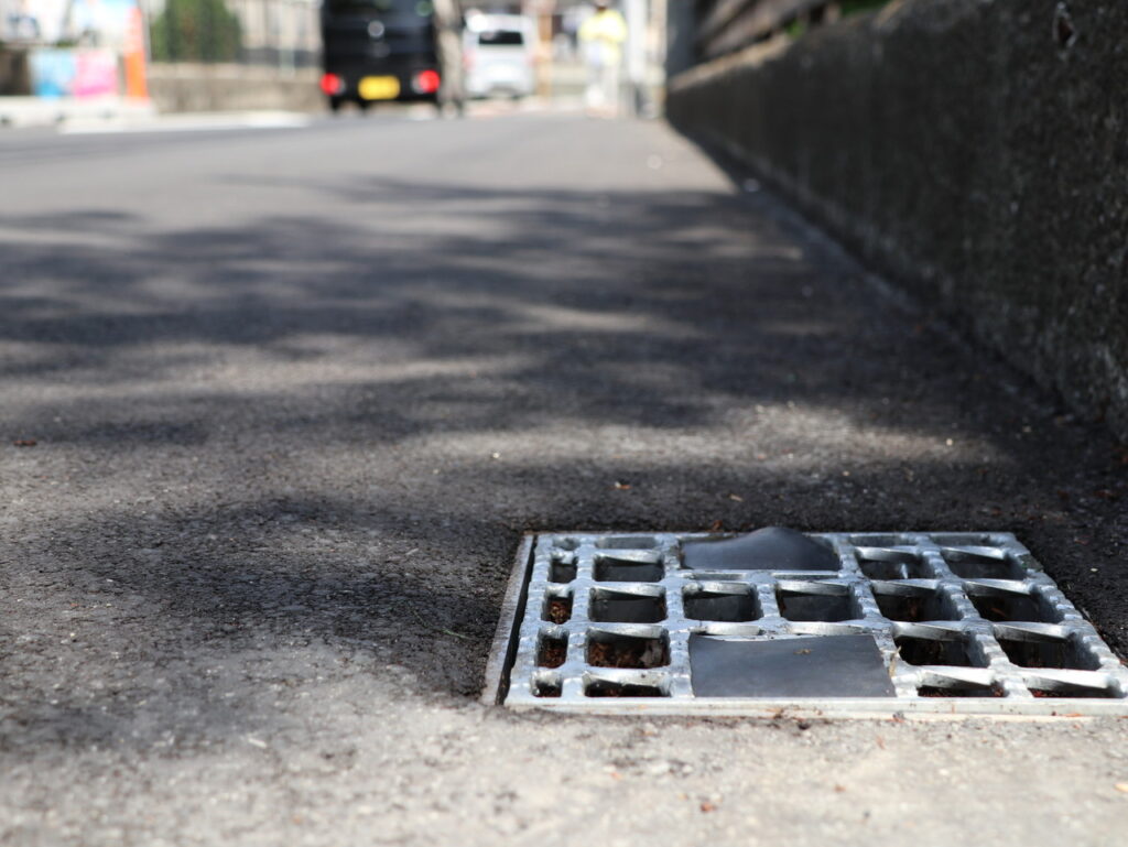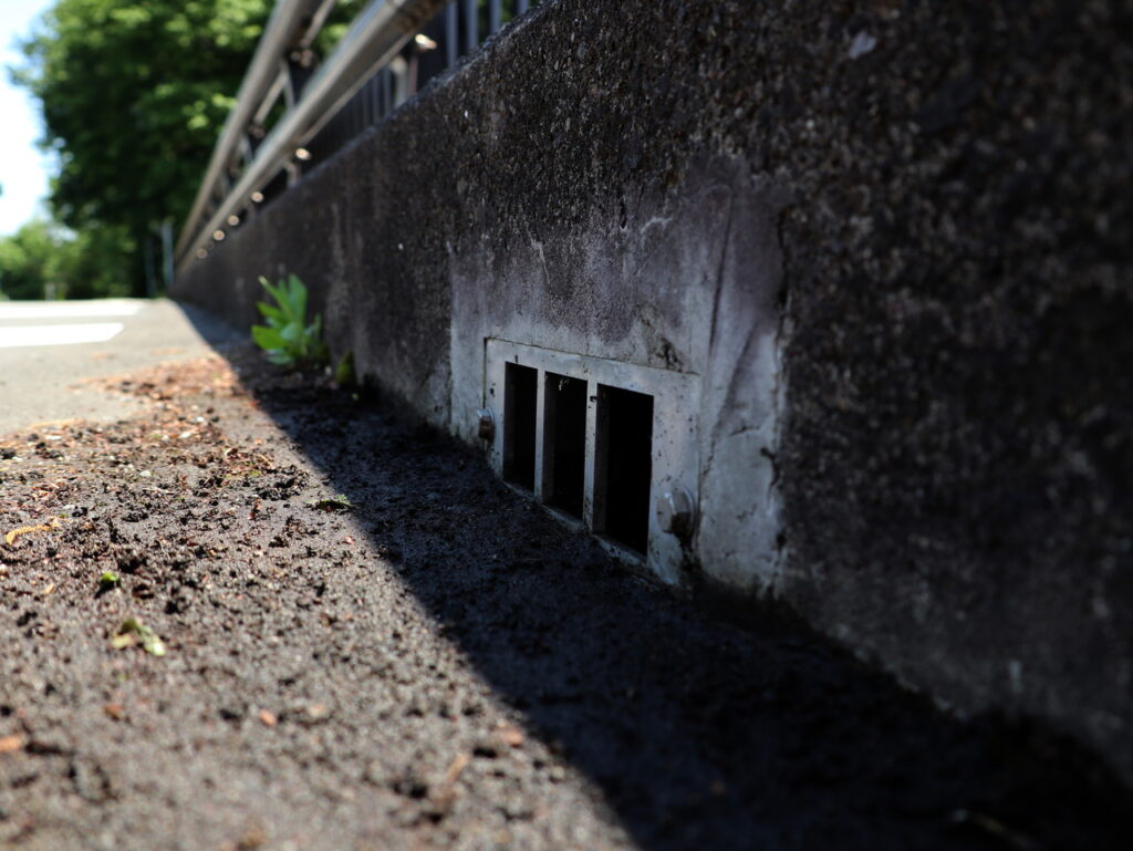 地覆横引きの延長の様な形で歩道の下に排水装置を通している事例