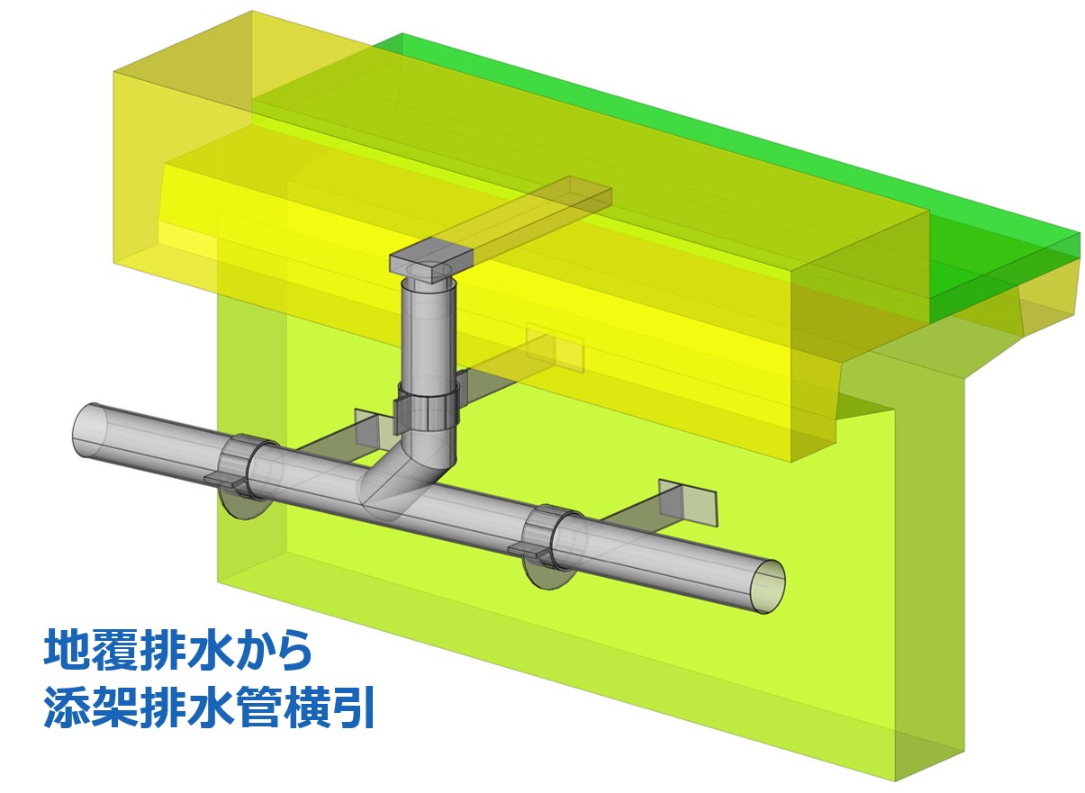 地覆横引(貫通)管から横引の添架排水管へ接続している例になります。