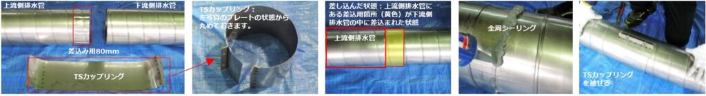 管同士の接続は下流側を80mm伸ばし、差込用の"つぶし"を作成、施工時に差込後、シーリングし「TSカップリング」を被せる仕様です。