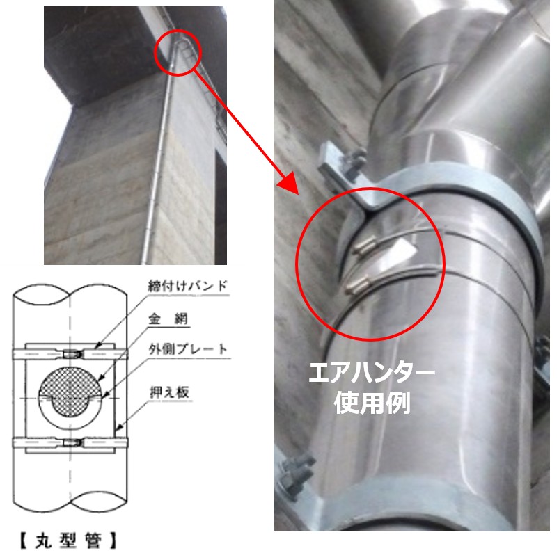 ●ゲリラ豪雨等による想定外の降雨時に排水管内へ負圧が発生し、伸縮継手を破損するばかりではなく排水管をも破損することがあります。この現象を低減させる為に、空気孔を設ける場合があります。写真、図面はメイコーエンジニヤリング株式会社の負圧対策専用品「エアハンター」を使用し対策を施した例になります。