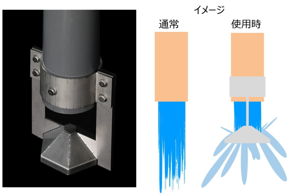 排水管流末に立体の六角形状のプレートを取り付けることにより排水の流れを分散させる効果を狙ったものです。