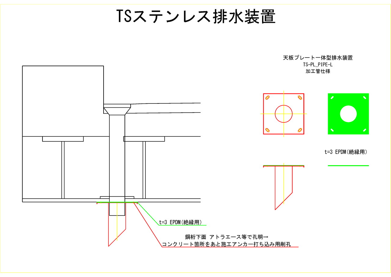 橋梁用TSステンレス排水装置のトーカイスパイラルです。1基、1本から提案・作図・製作を行っております。