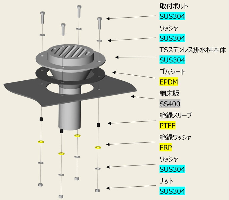 橋梁用TSステンレス排水装置のトーカイスパイラルです。1基、1本から提案・作図・製作を行っております。